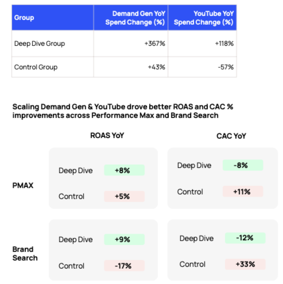 The downstream impact of investing this way shows up clearly in the Fospha data. Brands in their Q4 2025 program that scaled Demand Gen and YouTube saw ROAS and CAC improvements not just in those channels, but in Performance Max and Brand Search as well. Deep Dive brands increased Demand Gen spend 367% and YouTube spend 118% year over year and saw PMAX ROAS improve 8% and Brand Search ROAS improve 9% year over year. The control group, which scaled back YouTube and grew Demand Gen more modestly, saw the opposite.