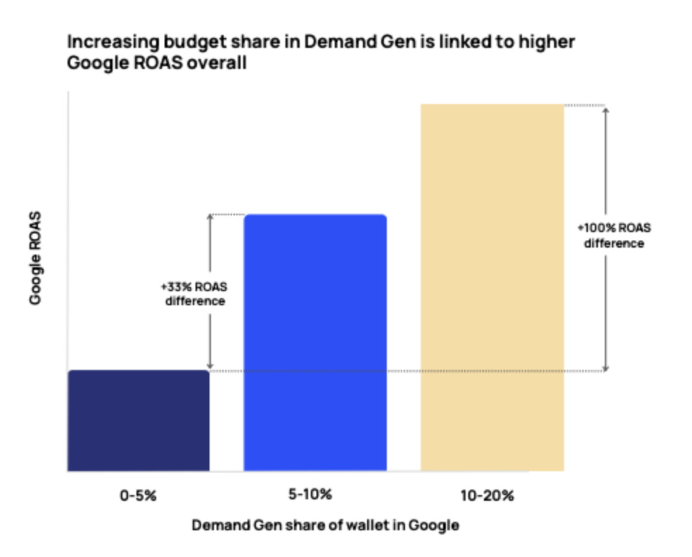 The budget allocation question also has a more concrete answer than most clients expect. In Fospha's research, brands allocating 10-20% of their total Google budget to Demand Gen achieved double the ROAS of brands allocating 0-5%. Most accounts spend well below that threshold, which means there's real headroom before hitting diminishing returns.